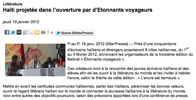Une première conférence de presse organisée à Port-au-Prince (Haïti) pour présenter l’édition d’Étonnants voyageurs (1er-4 février 2012). Lire la suite sur AlterPresse.