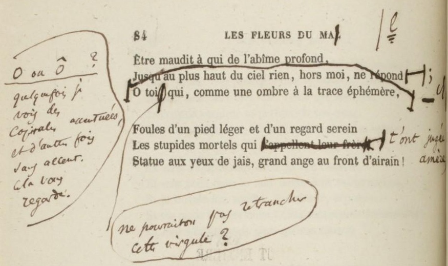 Un extrait des épreuves d’imprimerie des Fleurs du mal (Charles Baudelaire), p. 84, telles qu’elles sont consultables sur le site Gallica de la BNF :