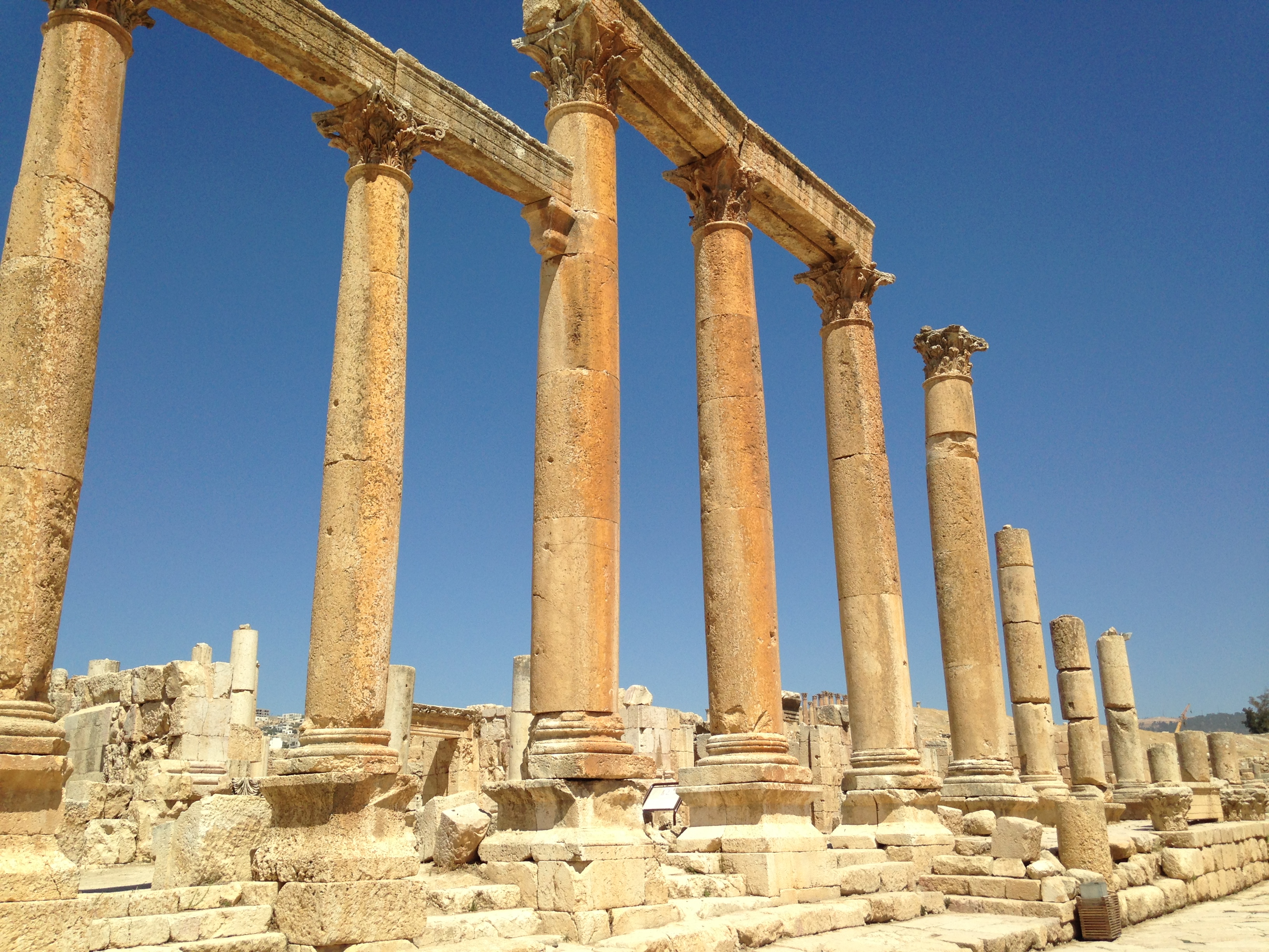 IMG_0778Colonnes corinthiennes sur la cardo maximus (axe principal Nord-Sud). Encore debout malgré le tremblement de terre du VIIIe siècle apr. JC.