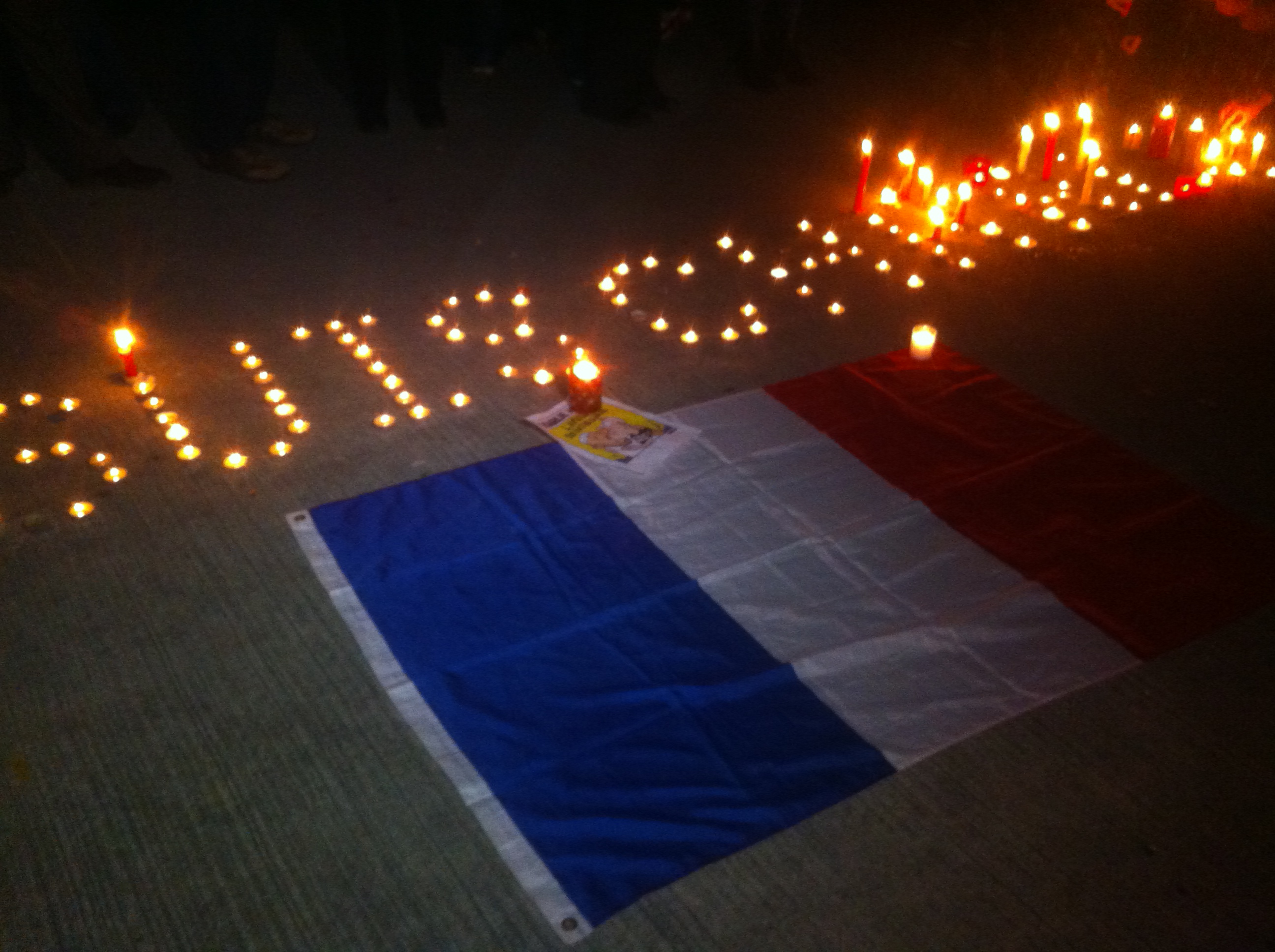 À Paris, la place de la République est noire de monde. Une foule silencieuse. Une foule compacte qui fait très grand nombre. Un homme monte sur la statue de la République et attache un brassard à son bras de géante. Applaudissements.