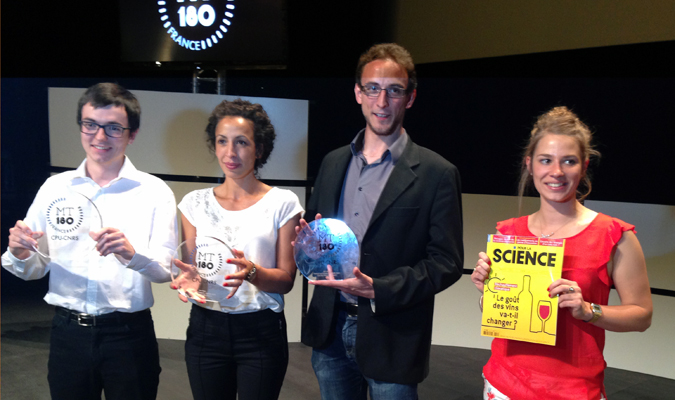 Les lauréats du concours Ma thèse en 180 secondes. De gauche à droite : Alexandre Artaud, 1er prix du jury et prix du public, Rachida Brahim, 2e prix du jury, Grégory Pacini, 3e prix du jury, et Camille Rouillon, Prix des internautes / Pour la Science.