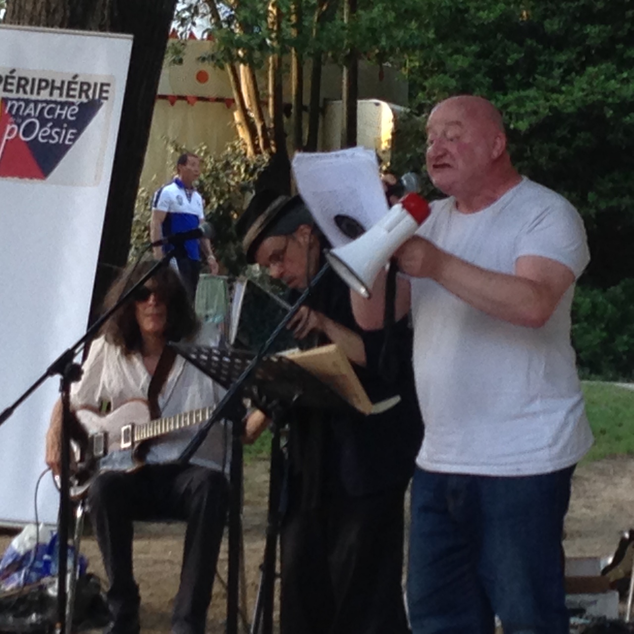 Aux Buttes-Chaumont ces deux-là sont faits pour s’entendre. Oui S’EN-TEN-DRE… Bien que leurs grains de voix soient fort différents, les percutions étudiées de leurs paroles s’accordent à merveille. Pennequin (à droite sur la photo) est porté par sa haute stature de déménageur de mots, Lavant (au milieu cherchant ses textes) par une belle raucité qui est aussi une dévoration de la langue.