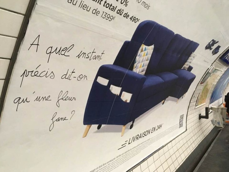 Distinguer ce moment et nommer sa mort, c’est habiter poétiquement le monde, fût-il moche ce monde, surtout à cet endroit, dans le métro gorgé de publicités, avec sa foule empressée. Une foule dont nous sommes chacun un élément à peine identifiable. Or, un jour, dans ce flux, un homme, une femme, s’est arrêté.e, est devenu photon, grain de lumière.