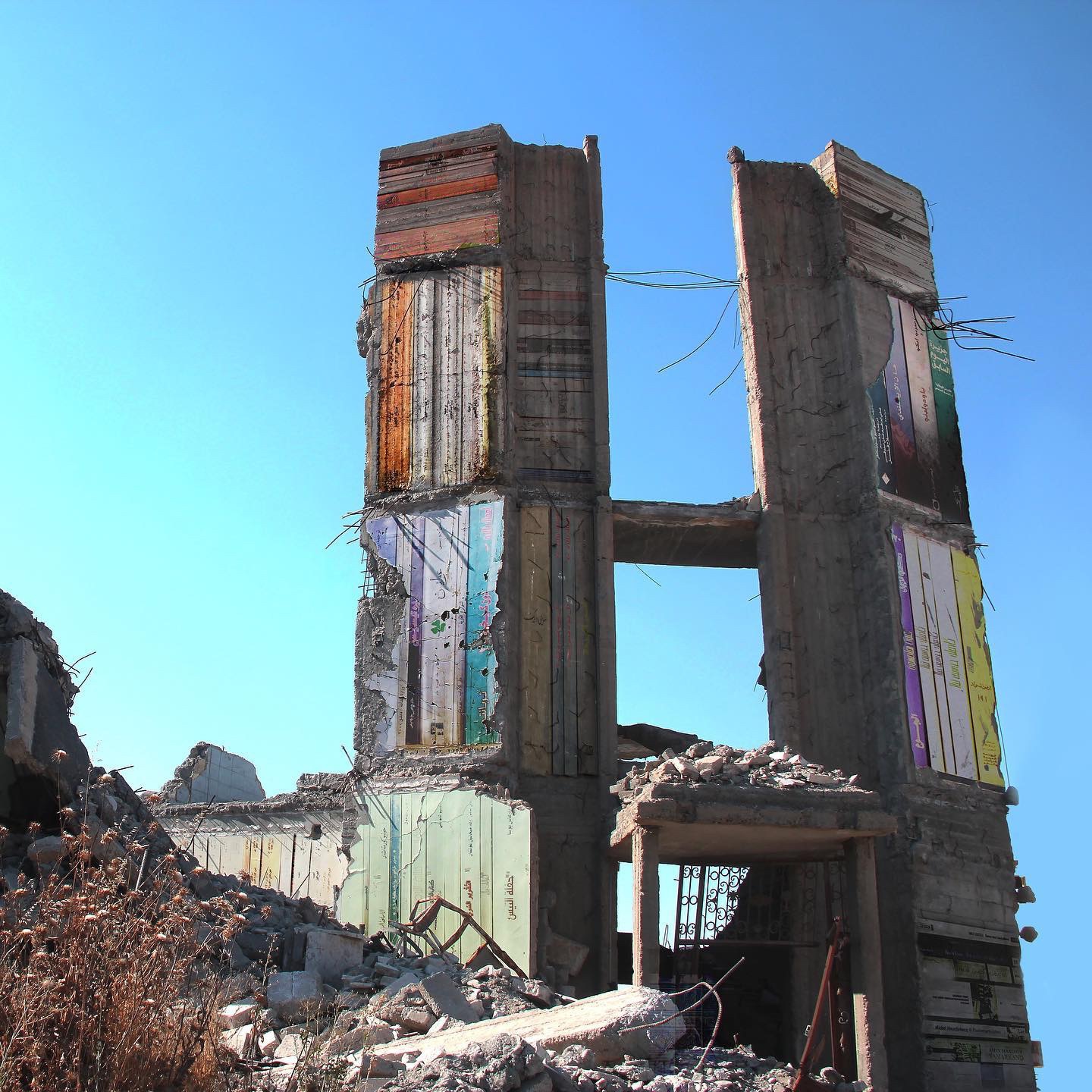 « Bibliothèque de Raqqa (Syrie), photomontage et collage papier sur toile, 100 x 80, 2019 », par Tammam Azzam.