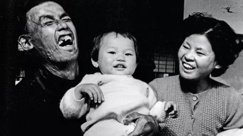 Lors de son reportage à Hiroshima en 1957, ce photographe japonais prend 7 500 photographies. Son propos est de montrer les séquelles de l’événement plus d’une décennie après. Cette photographie est celle d’un couple de victimes ou hibashukas (survivants de la bombe) qui se sont connus à l’hôpital et se sont mariés. Ils posent avec leur enfant en bonne santé. La joie se perçoit sur le visage du père qui porte pourtant de terribles séquelles.