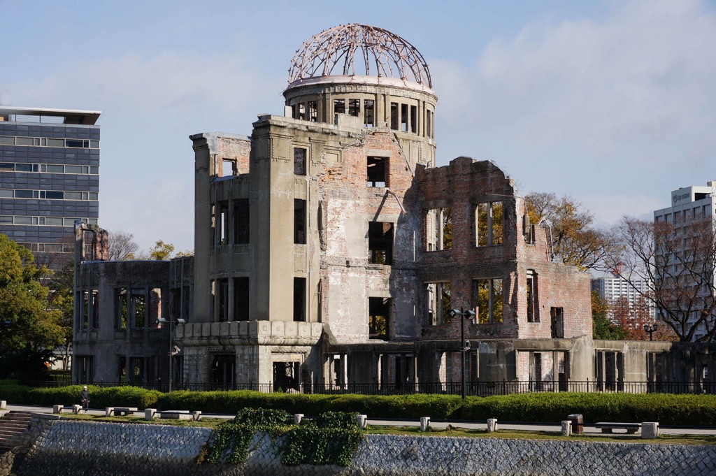 Le Dôme de la bombe A ou Dôme de Genbaku est le Mémorial de la Paix d’Hiroshima. Il fut le seul monument à rester debout près du lieu où explosa la bombe. Conservé tel quel, il témoigne à la fois d’une destruction massive humaine et d’un espoir de paix.]