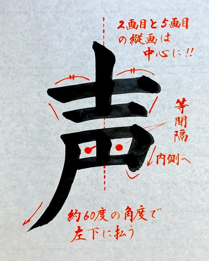 La voix étonnamment japonaise du bibliothécaire me fait penser à la calligraphie de Matsumoto Shoeido, qui explique sur son blog comment écrire voix [humaine], soit 声 (koe) :