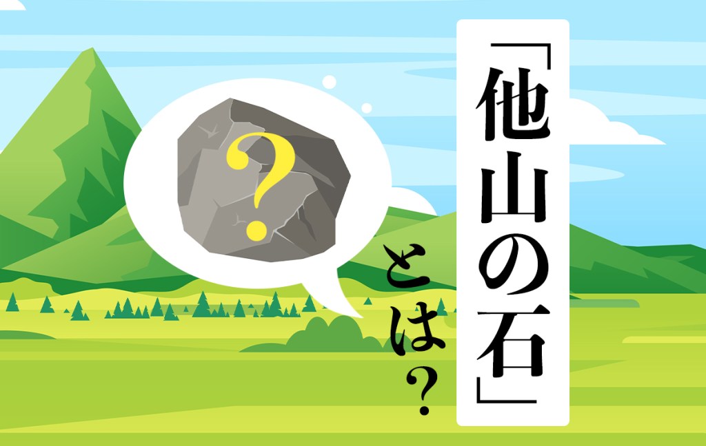 他山の石 (Tazan no ishi) est littéralement : la pierre d’une autre montagne, soit : « La pierre de la montagne voisine peut servir à aiguiser ses propres connaissances. », selon le recueil Proverbes et dictons du Japon (Trad. Izumi Kohama, Xavier Moulin. Préface Alain Kervern, Géorama, 2022, p. 55), qui ajoute : « Dans la culture japonaise on associe le fait d’aiguiser ses connaissances à l’image du katana – sabre du samouraï – que l’on affûte. Se servir d’une pierre à aiguiser inconnue signifie rester ouvert pour enrichir son propre monde. »