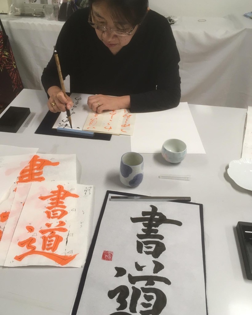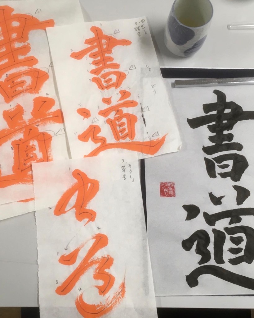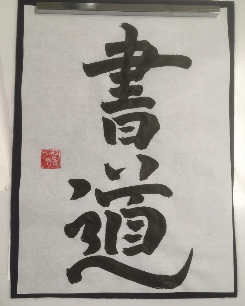 Le but de l’atelier est d’initier et au mieux de faire sien un kanji choisi. Il a été choisi par l’élève pour diverses raisons. Prenons par exemple le duo de kanji formé par 書道 (shodō), soit « la voie de l’écriture », autrement dit la « calligraphie ». Simplement parce qu’il est jugé « beau » ou qu’il correspond à votre humeur du moment.