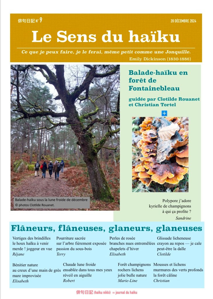 Le Sens du haïku est une gazette sur les balades-haïkus en forêt près de Paris. La dernière édition, le 15 décembre, date de la lune froide, explorait quelques sentiers en forêt de Fontainebleau. C’était la première sortie de la saison 2 de cette aventure botanique et poétique menée par Clotilde Rouanet, grande lectrice de paysage, et Christian Tortel, amateur de cette forme brève, venue du Japon, le haïku 俳句, dont l’ambition est de se saisir du vivant, de faire de l’insignifiant un événement et d’en écrire trois lignes composées dans leur totalité de 17 syllabes.