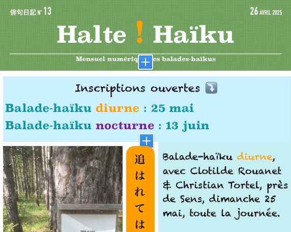 C’est l’une des balades à venir, présentée dans Halte!Haïku nº13, dont une Balade-haïku nature, avec Clotilde Rouanet, près de Sens (Yonne), et autres rubriques, ateliers, florilèges, etc.