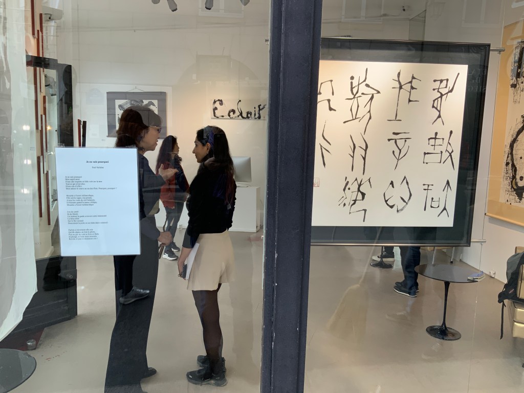 Paris, en face du Pont-Neuf, côté Rive gauche, une vitrine, celle de la galerie Mizen Fine Art Gallery, dont l’emplacement est exceptionnel au cœur de Paris, présente une écriture chinoise de 3 000 ans. Elle dessine la traduction japonaise d’un poème de Verlaine commençant par ces mots :