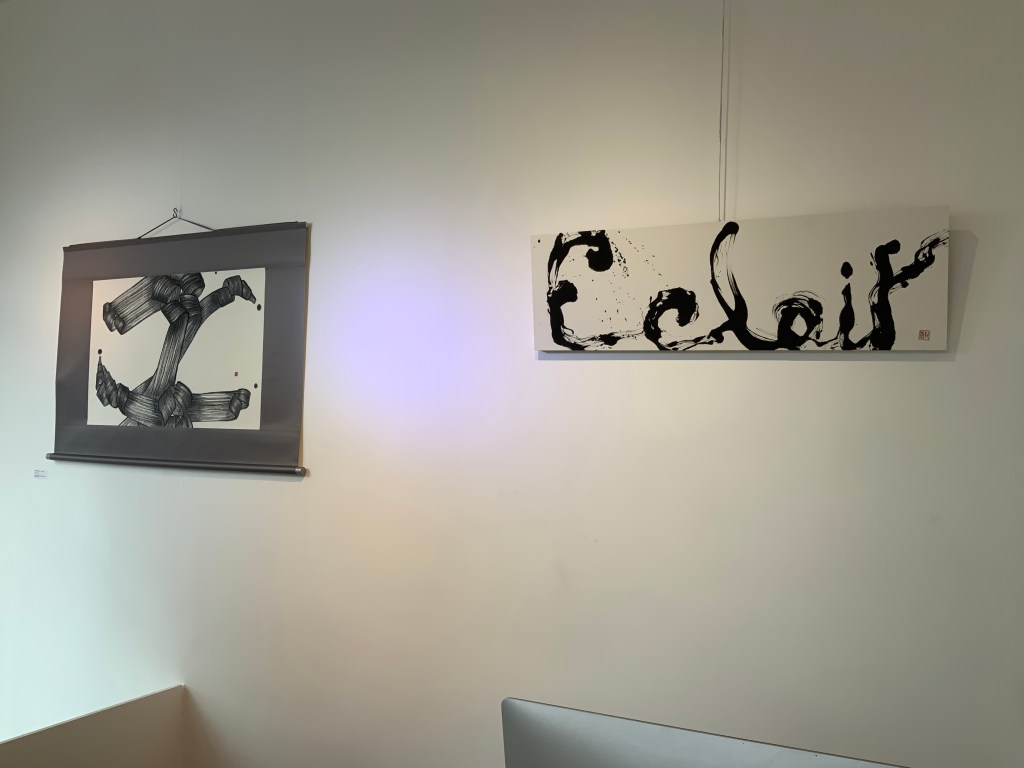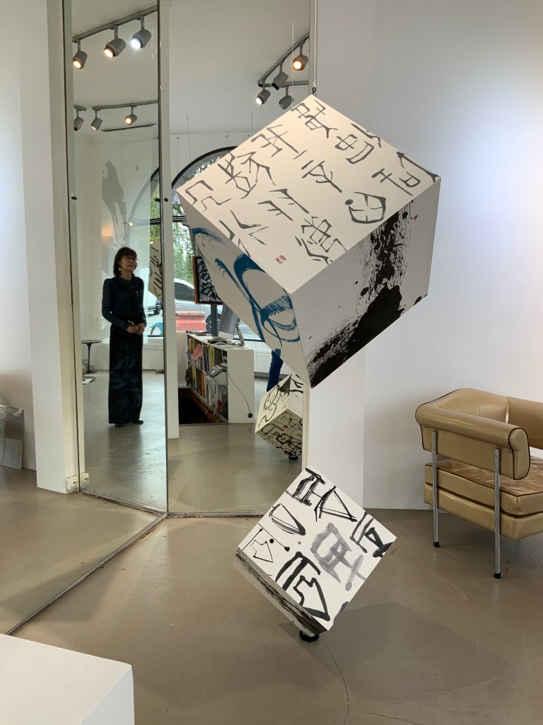L’artiste calligraphe venue de Fukuoka reprend l’association poésie, calligraphie, art contemporain, dans deux cubes qui reposent sur une pointe, l’un en suspension :