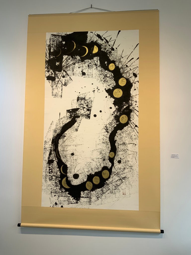 Enfin, troisième forme, la plus grande : 龍の月 (Le Dragon et la Lune), une encre sur papier et soie, où le satellite de la Terre parcourt l’arc d’une constellation, celle du Dragon :