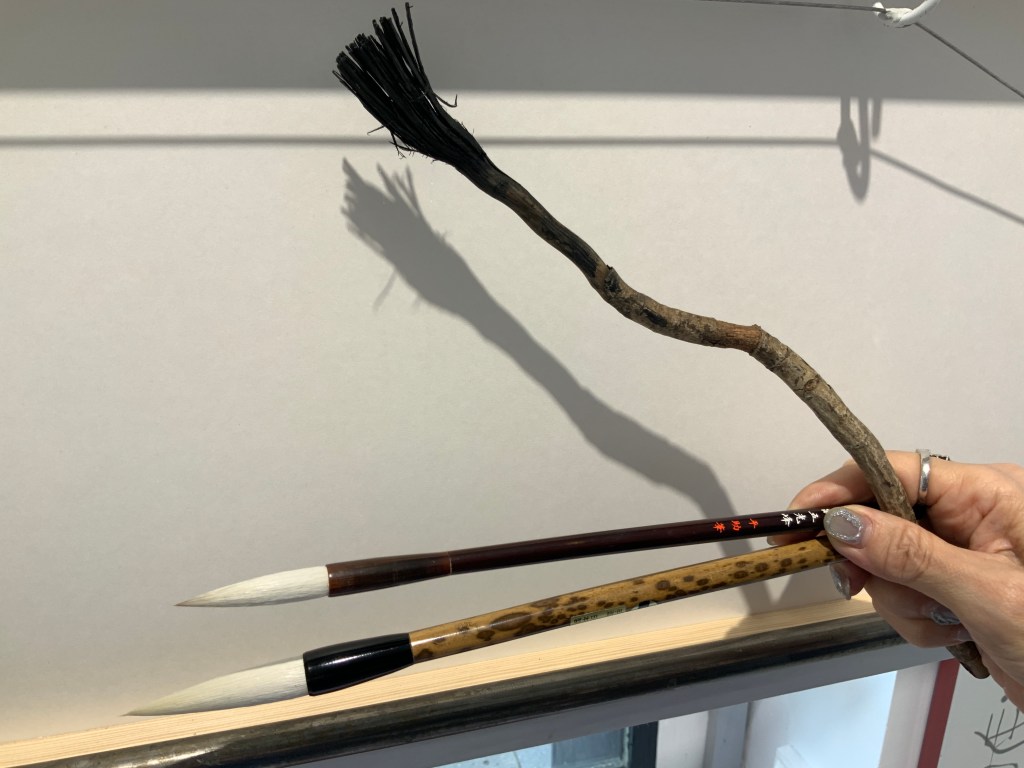 Parmi les deux autres propositions de l’artiste, des bandes en gris et noir, bandages de l’ère Corona, et son besoin de consolation. À côté le mot Éclair est dessiné à l’encre de Chine, non avec un pinceau mais avec une tige de bois façon plumeau :
