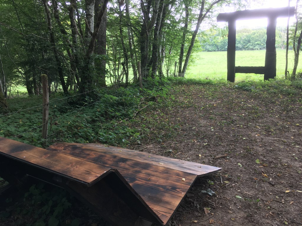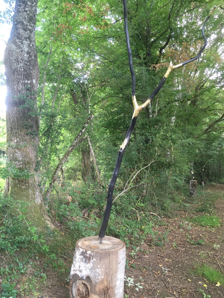 Sur le corps de ferme, un « Soleil noir » de 2,40 m de diamètre présente sa face brûlée au visiteur avant qu’il n’emprunte une allée profonde en pente légère. Les œuvres vous font une haie d’honneur. Elles sont plantées sur une buche, forment une fourche et les branches sont brûlées mais des portions sont recouvertes d’or. Effet saisissant d’une presque revitalisation. On pense au kintsugi, cet art japonais qui consiste à restaurer des céramiques ou des porcelaines cassées qu’on va recouvrir comme nervures cousues d’or.