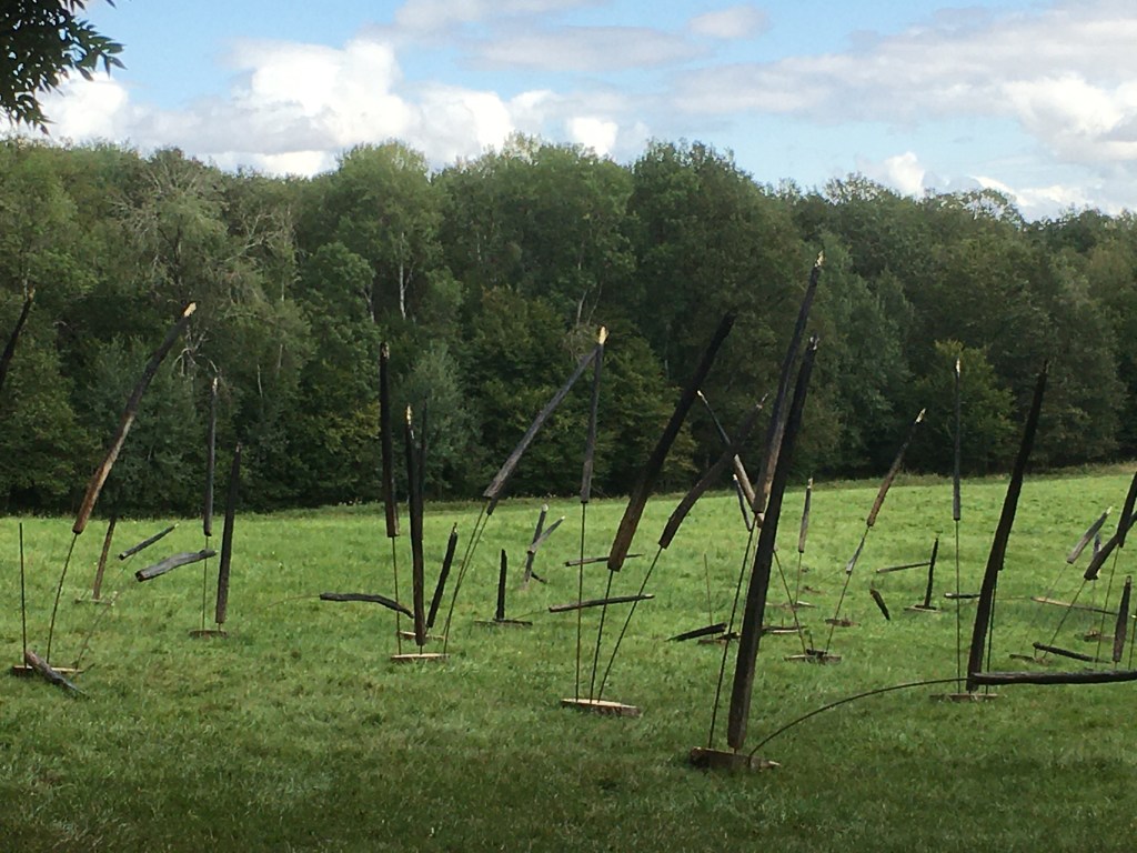 « Divagation » car l’exposition se présente à ciel ouvert, dans le domaine agricole où le visiteur suit au gré des œuvres et de son imaginaire un parcours de sentes et chemins autour d’un plan d’eau.