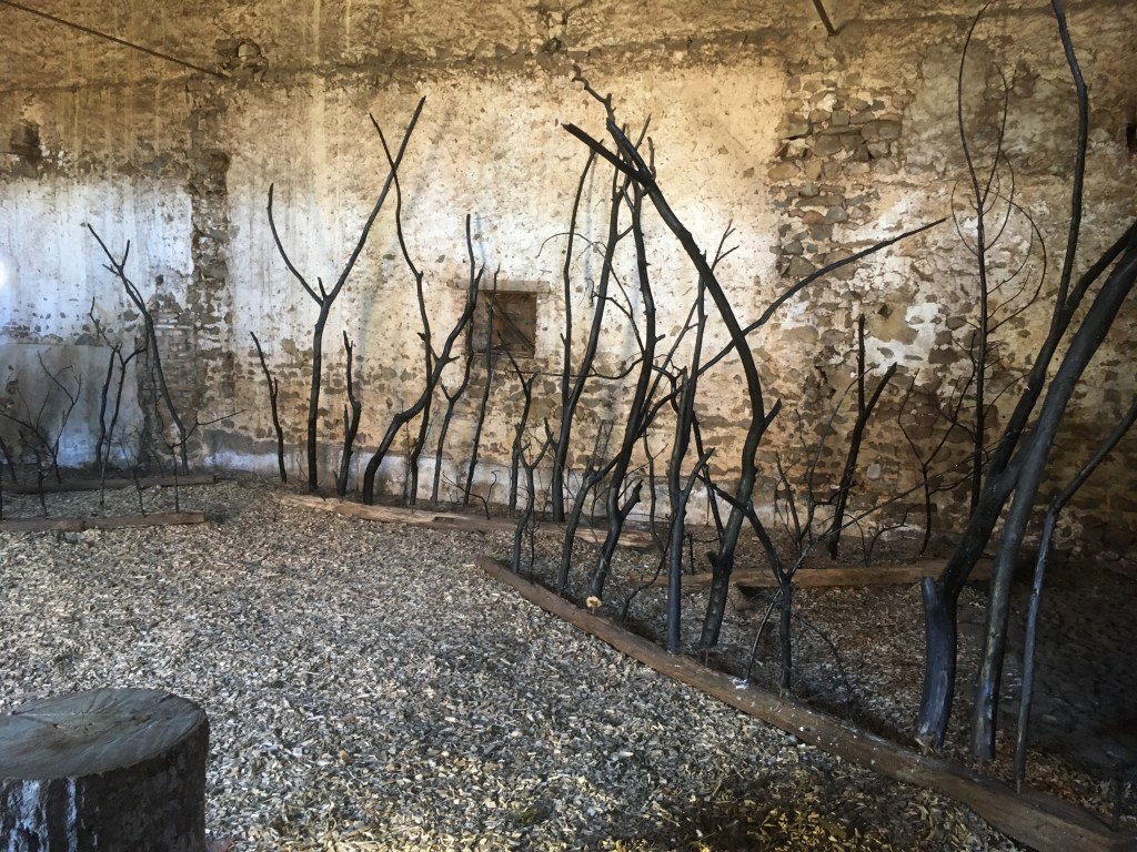 Retour au point de départ, aux côtés de la chimère mi arbre mi sculpture de l’entrée, dans une ancienne grange, les bois brulés éclairés le soir donnent l’impression que la forêt brûle…