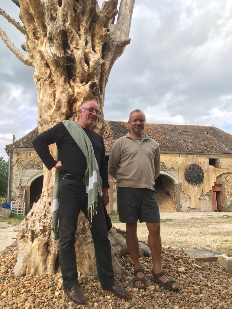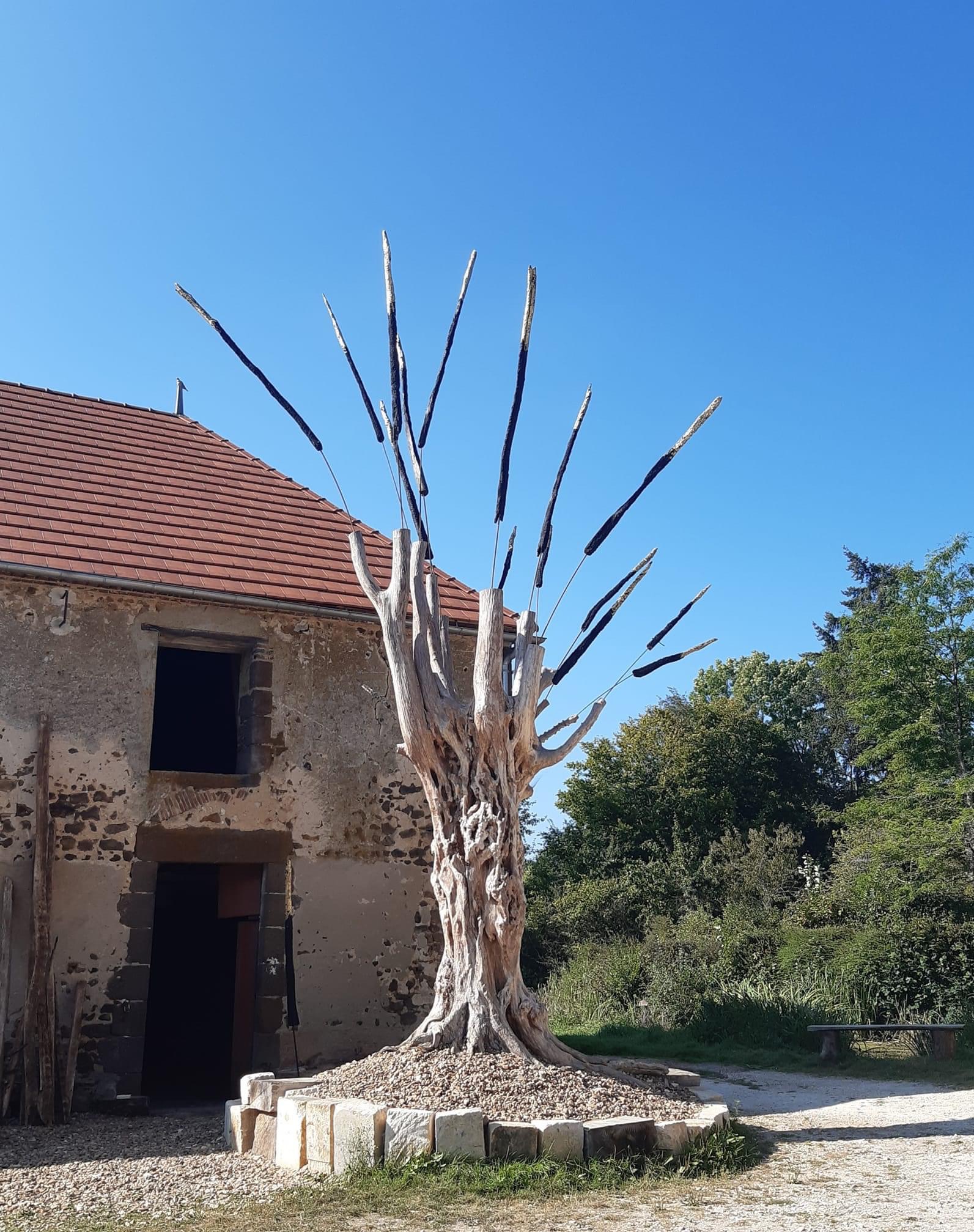 Dans la cour de la ferme d’Hugues Barrey au Metz, dans la région de la Puisaye, au sud de Paris, entre Orléanais, Nivernais et Bourgogne, une installation impressionnante vous accueille, une chimère mi arbre mi sculpture, un tronc centaure fait d’un bas-arbre et d’un haut en tiges de bois brûlé, deux matières mortes « mais c’est vivant ! », s’exclame Pierre Marty en ce dimanche de la fin du mois d’août.