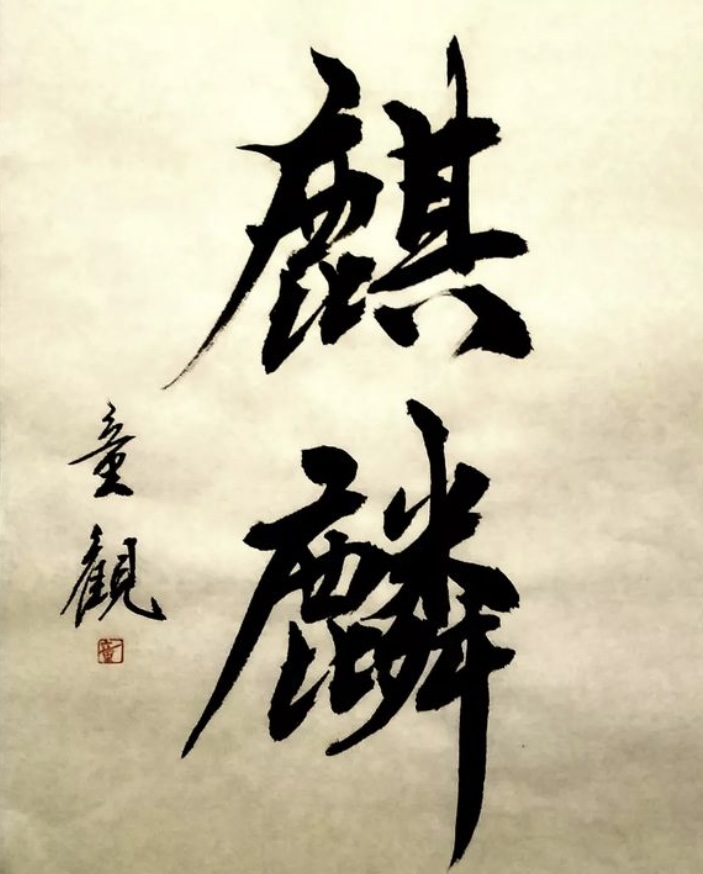 [麒麟 (kirin), soit « licorne », calligraphie de doukan_shodo, composée de 42 traits. Voir son compte Instagram]