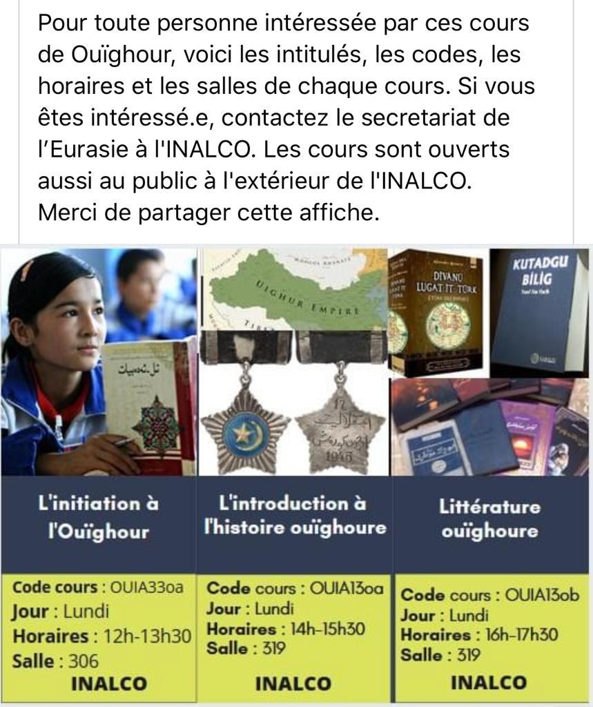 Xosh xewer (bonne nouvelle) : à partir de cette semaine Dilnur propose trois cours différents : langue, histoire et littérature ouïghoures. La situation faite aux Ouïghours en Chine n’est sans doute pas étrangère à cet engagement de l’INALCO (Institut national des langues et civilisations orientales) en faveur de la culture ouïghoure.