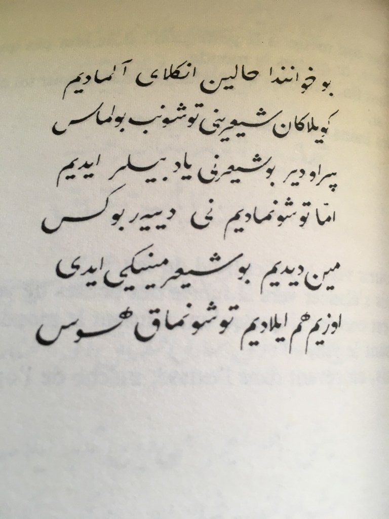 Jusqu’en 1927, l’ouzbek, qui est une langue turcique, était écrit en caractères arabes. La langue littéraire d’Alisher Navoï est du tchaghataï, proche de l’ouzbek et du ouïghour actuels. À l’origine langue administrative, elle servit de langue littéraire au XVe siècle en Asie centrale.