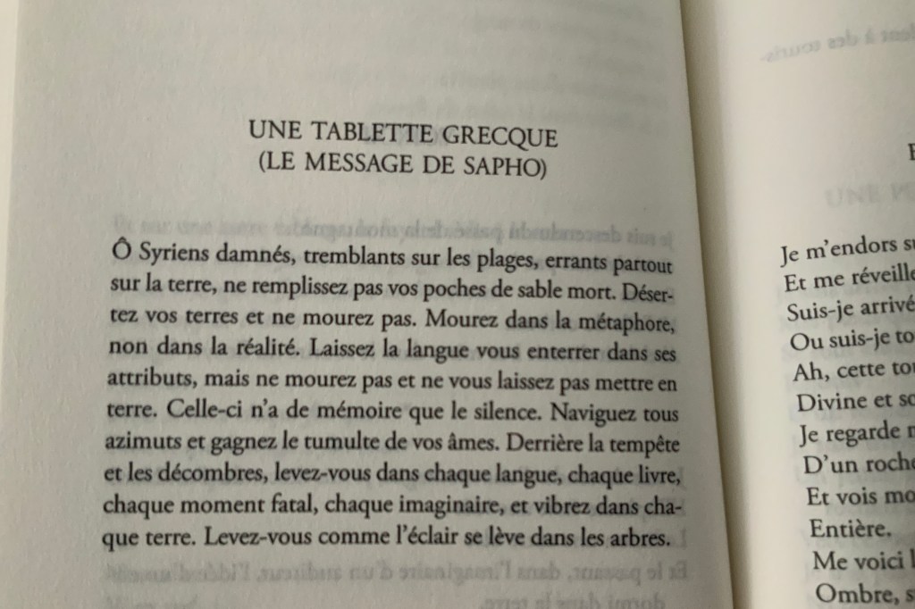 « Ô Syriens damnés, (…) levez-vous dans chaque langue, chaque livre, chaque moment fatal, chaque imaginaire, et vibrez dans chaque terre. Levez-vous comme l’éclair se lève dans les arbres. »